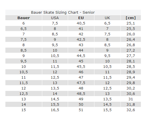 | SENIOR - BAUER SKATE SIZING CHART | |||