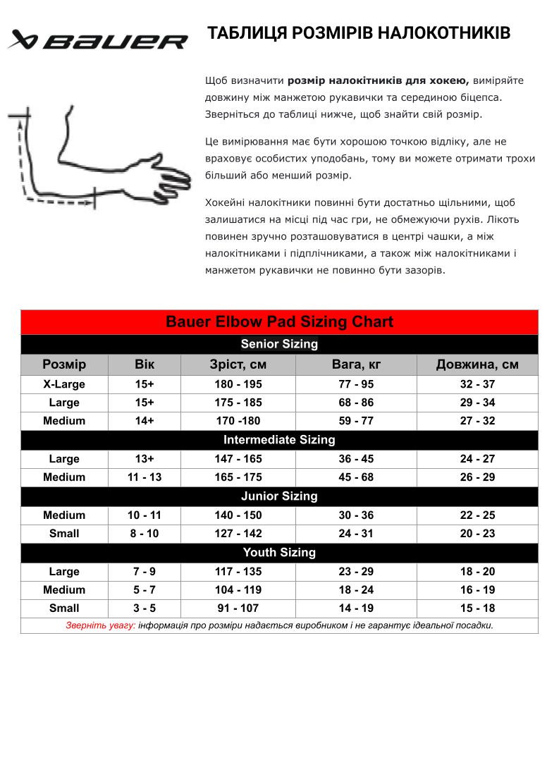 Роздільна конструкція ковпачка та анатомічно сформоване передпліччя на налокітнику забезпечують кращу мобільність і стандартний комфорт. Для захисту Bauer використовує лиття під тиском і формовані вставки, щоб захистити від поширених хокейних явищ, таких як слеші та блоковані удари.